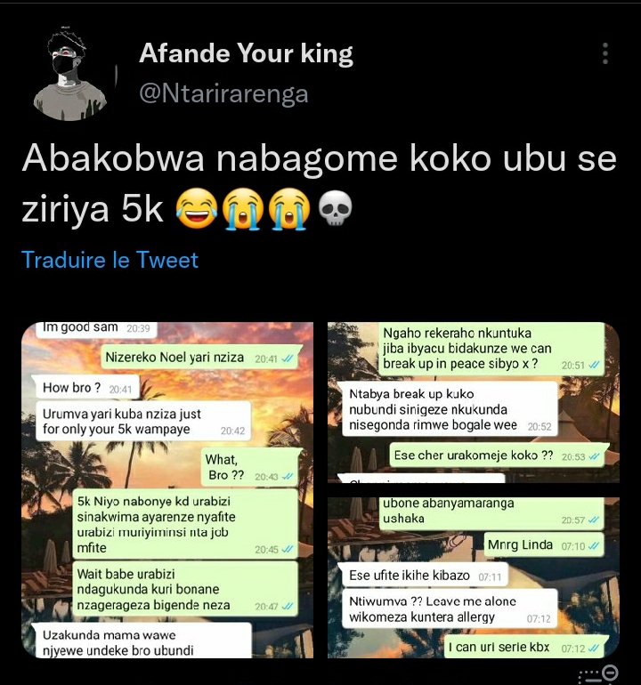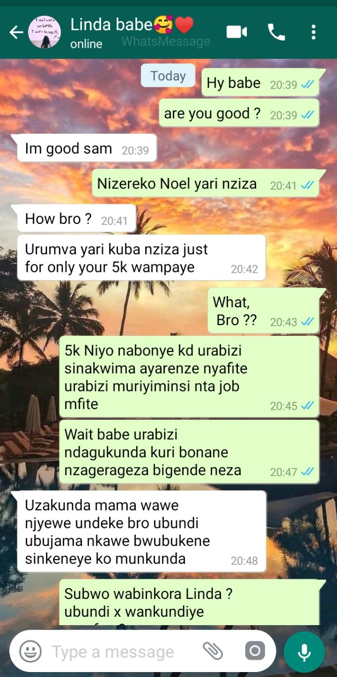 Mu kiganiro cyabaye hifashishijwe ubutumwa bwa  WhatsApp itari iya nyayo(Fake WhatsApp) bigaragara ko umusore yoherereje umukunzi we ibihumbi 5 ,amwiseguraho ko ariyo yabashije kubona kuko ntakazi afite ariko ko kuri Bonane azamwitaho.Mu kumusubiza umukobwa yahise amwihenuraho ko adashobora gukundana n’umusore w’umukene ndetse  ko atigeze amukunda na gato, birangira amuteye indobo.