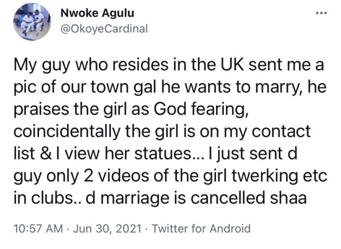 Umusore kuri Twitter wamenyekanye nka Okoye Cardinal yahisemo guhagarika ubukwe ku munsi wa nyuma akimara kubona utuvidewo tubiri, turimo uwo bari bagiye gushyingiranwa, arimo abyina amansura .