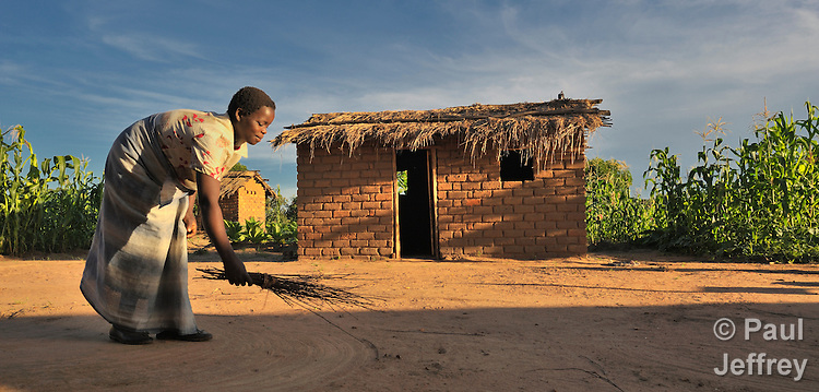 Florence Shawa, a resident of the northern Malawi village of Thundira, sweeps the ground in front of her home early in the morning.