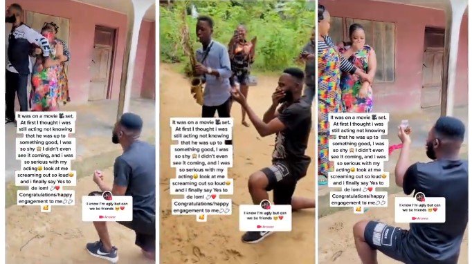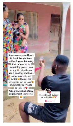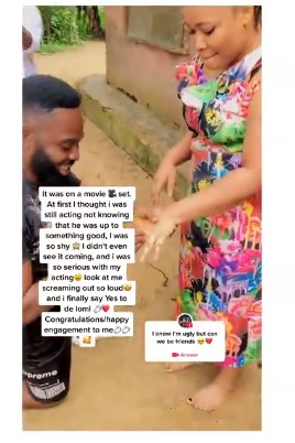 Ubwo uyu mukobwa yarimo gukina filime barimo kumufata amashusho na bagenzi be uyu musore yahise aza apfukama imbere ye maze amwambika impeta.Umukunzi we, wagize uruhare runini mu gukina kwe, ntabwo yari azi ibibaye kuko yari afunze amaso.