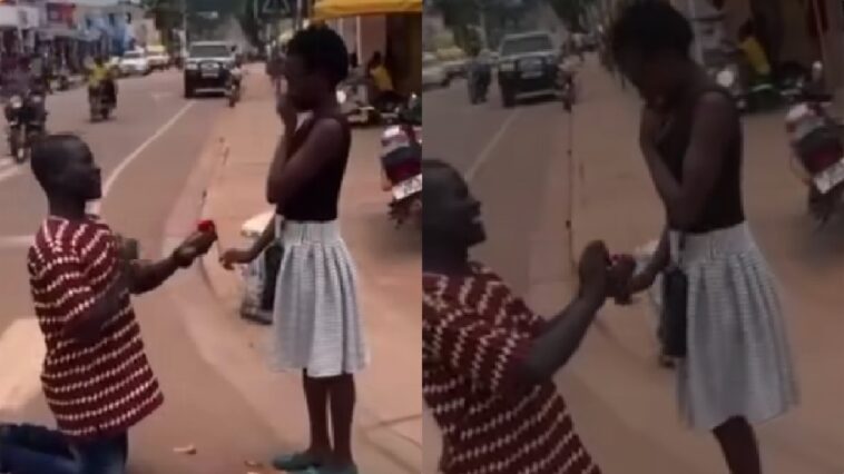 Mu mashusho yakwirakwijwe ku mbuga nkoranyambaga zigiye zitandukanye, yerekana uyu musore yateye ivi, ni uko maze uwo mukobwa akamwemerera kumubera umugore.