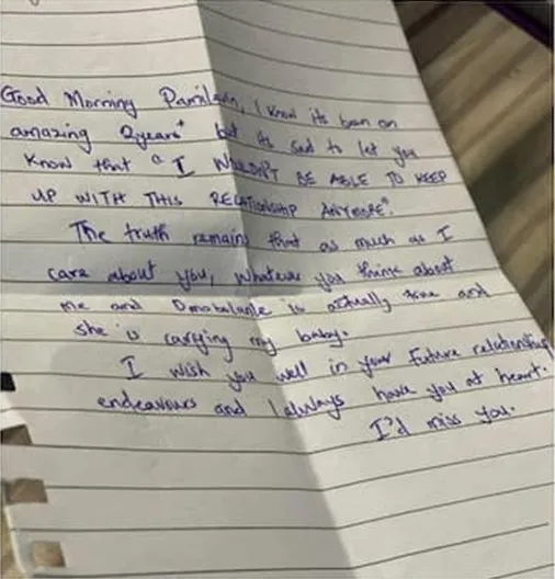 Mu nyandiko yasangijwe mu itsinda rya Facebook, yamwitiriye izina rye, Pamilerin maze avuga ko imyaka ibiri bamaranye yari igitangaza.Icyakora, uyu mugabo yagaragaje akababaro ko atagishoboye gukomeza umubano kuko undi muntu amutwitiye.Yakomeje amwifuriza ibyiza mu bihe biri imbere, yongeraho ko azahora mu mutima we.