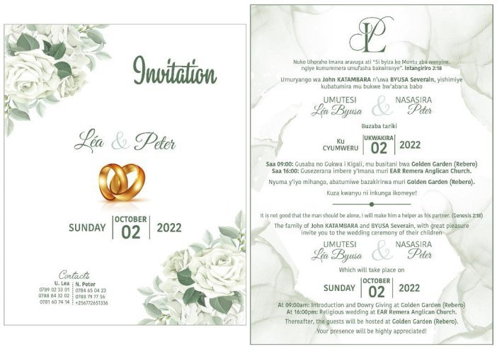Kuri uyu munsi Umutesi lea na Peter Nasasira bashyize hanze impapuro zitumira imiryango n’inshuti kubashyigikira mu bukwe bwabo.