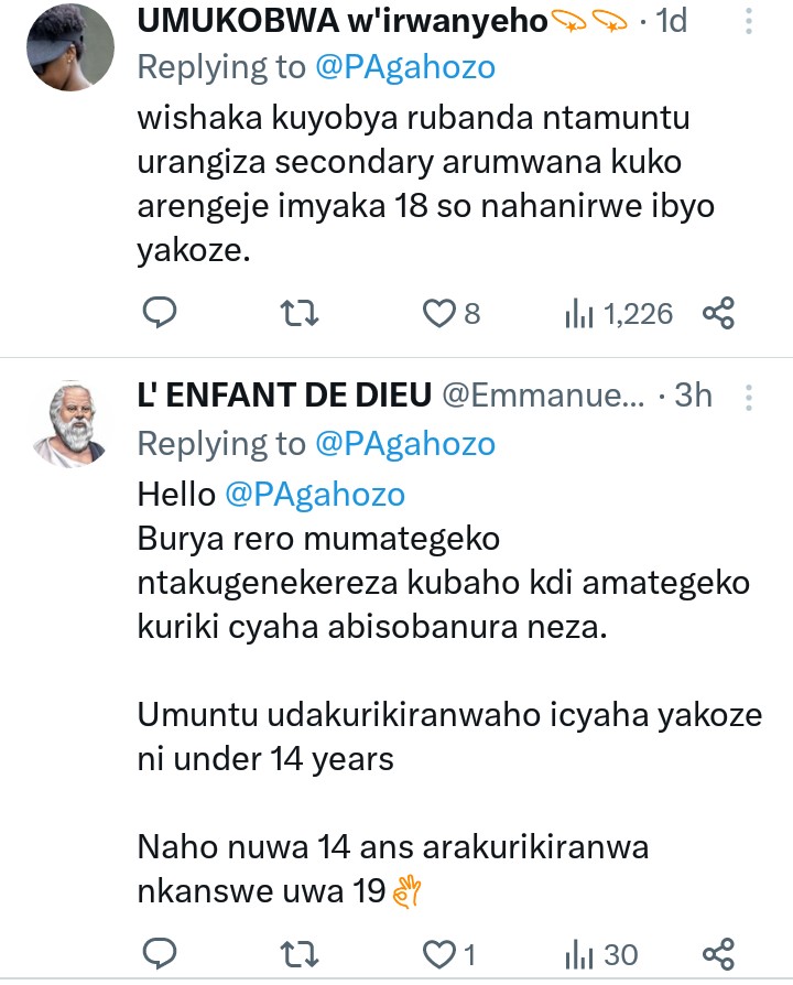 Umwe mu Banyarwandakazi bakoresha urubuga rwa X, abinyujije kuri uru rubuga yasabye ko uyu mwana atajya gufungwa cyangwa ngo abuzwe amahirwe yo kwiga, ahubwo ko yaganirizwa kuko yari akiri Umwana.