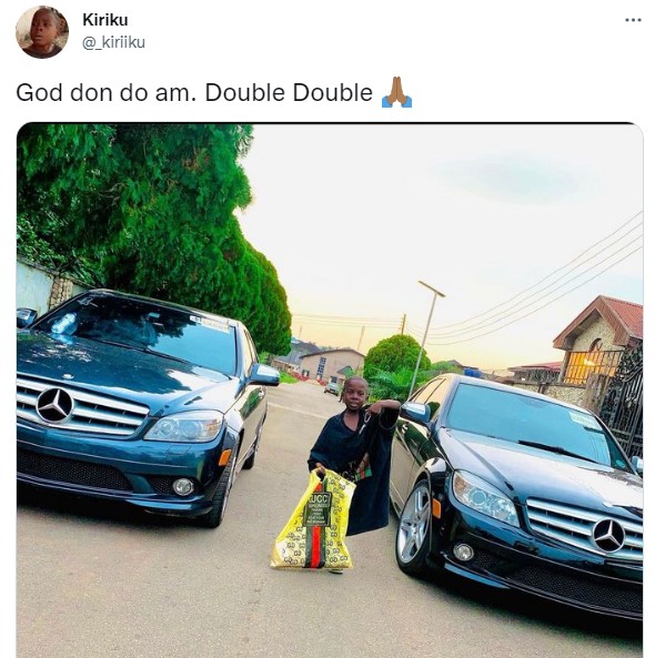 Uyu mwana yasangije ifoto ye yifotoje hagati ya Mercedes Benz ebyiri z’umukara kandi ashimira Imana kuba yaramuhaye imbaraga zo kuzigura.