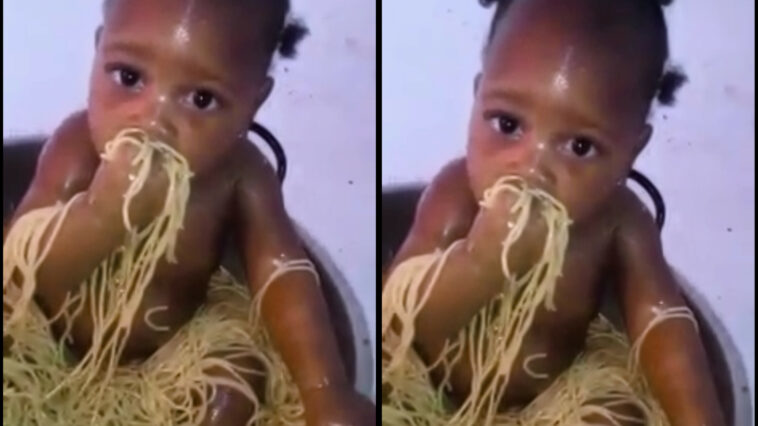 Umwana ni umugisha w’Imana! Umwana muto yiyicariye mu isafuriya y’amakaroni ubundi arayarya karahava koko(Amashusho)