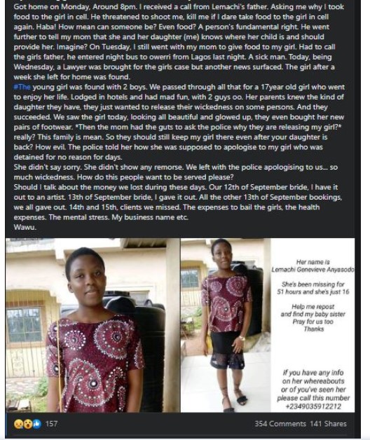 Nk’uko Annastecia Mary Lyon yabitangarije kuri Facebook ngo uyu mukobwa w’imyaka 17 yavuye mu rugo hashira iminsi itatu ntawuzi irengero rye maze hashyirwaho ingufu zo kumushakisha.