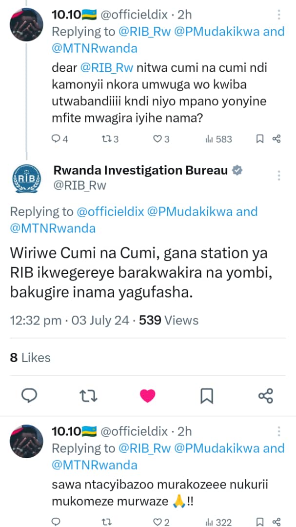 RIB yahise imusubiza ubutumwa bugira buti “Wiriwe Cumi na Cumi, gana station ya RIB ikwegereye barakwakira na yombi, bakugire inama yagufasha.”