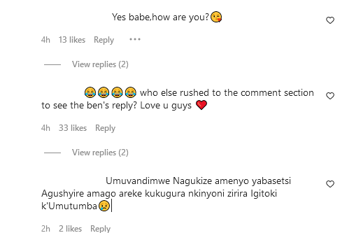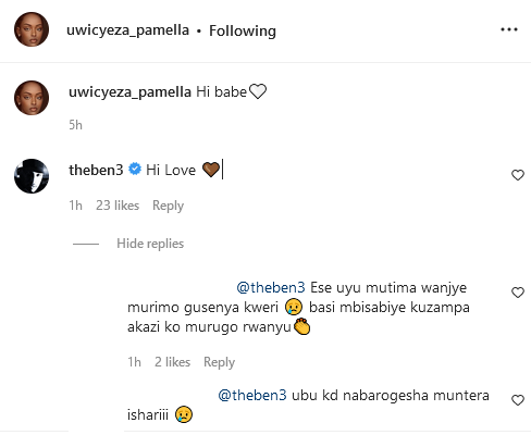 The Ben amaze kubona igikorwa Miss Pamella yakoze aricyo cyo gupostinga ifoto ye akandikaho amagambo agira ati “Uraho Mukunzi🤍” , The Ben nawe yahise amusubiza mu magambo agira ati “Hi Love 🤎” ugenekereje mu Kinyarwanda bishatse kuvuga ngo “Uraho Rukundo 🤎”.
