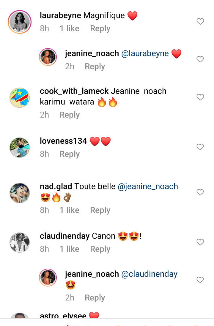 Nk’uko bigaragara ku ifoto uyu Jeannine yashyize hanze yari yambaye umwambaro ugaragaza uko amabere ye ateye.Mu bitekerezo byatanzwe kuri iyi foto abafana bamwerekaga uburyo bamukunda ndetse ko ari mwiza.