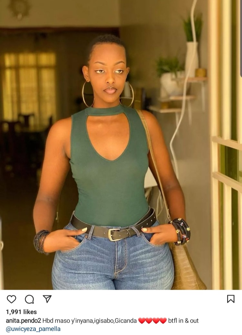 Anita Pendo yifashishije ifoto ya Uwicyeza Pamella yanditse kuri instagram ye ataka uyu mukobwa watwaye umutima w’umuhanzi the Ben maze amubwira ko ari mwiza imbere n’inyuma kandi ko ateye nk’igisabo .Mu magambo ye Anita yagize ati:”Hbd maso y’inyana,igisabo,Gicanda ❤❤❤❤ btfl in & out @uwicyeza_pamella”