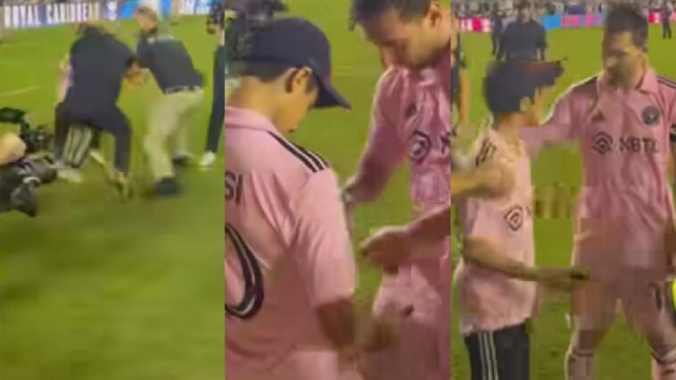 Umwana muto wari wambaye umupira w’ikipe ya Inter Miami ya Lionel Messi, yinjiye mu kibuga ashaka gukora kuri Lionel Messi gusa umurinda yari akivuganye.