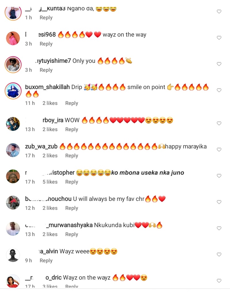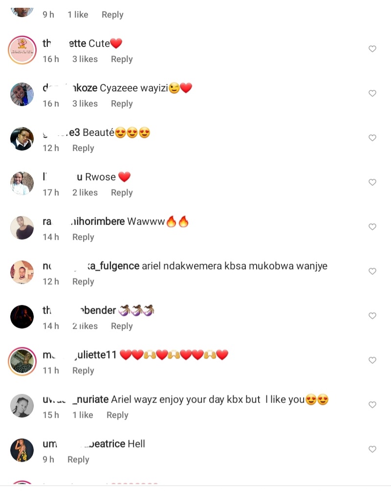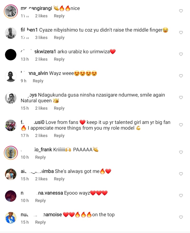 Umuhanzikazi Ariel Wayz umaze kwamamara muri muzika Nyarwanda ndetse unakurikirwa n’abatari bake ku mbuga nkoranyambaga ze yatewe imitoma n’abafana be nyuma y’amafoto mashya yashyize kuri Instagram agaragaza inseko idasanzwe. Uyu mukobwa ukunze kwifotoza azamura urutoki rwa musumbazose ,benshi badakunda kuri iyi nshuro yifotoje bisanzwe ariko aseka cyane.Ibi byatumye abafana be bajya ahandikirwa ubutumwa baramutomagiza karahava.