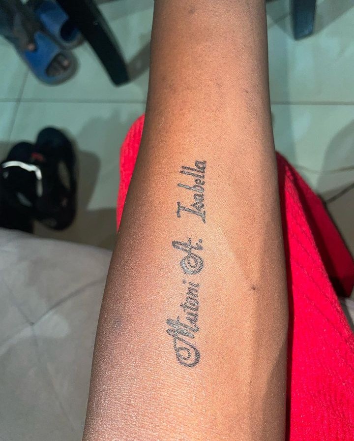 Tatuwaje yayishyize ku kaboko ke k’ibumoso yandika ho amazina y’umukunzi we.