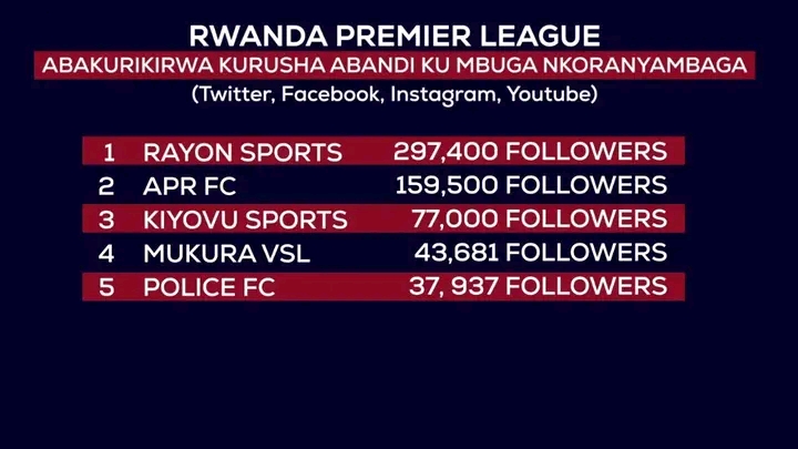 Hari ikegeranyo cyakozwe kigaragaza uko amakipe yo mu Rwanda akurikirwa ku mbuga nkoranyambaga nka Twitter, Facebook, Instagram na YouTube. Urutonde ruyobowe na Rayon Sports.