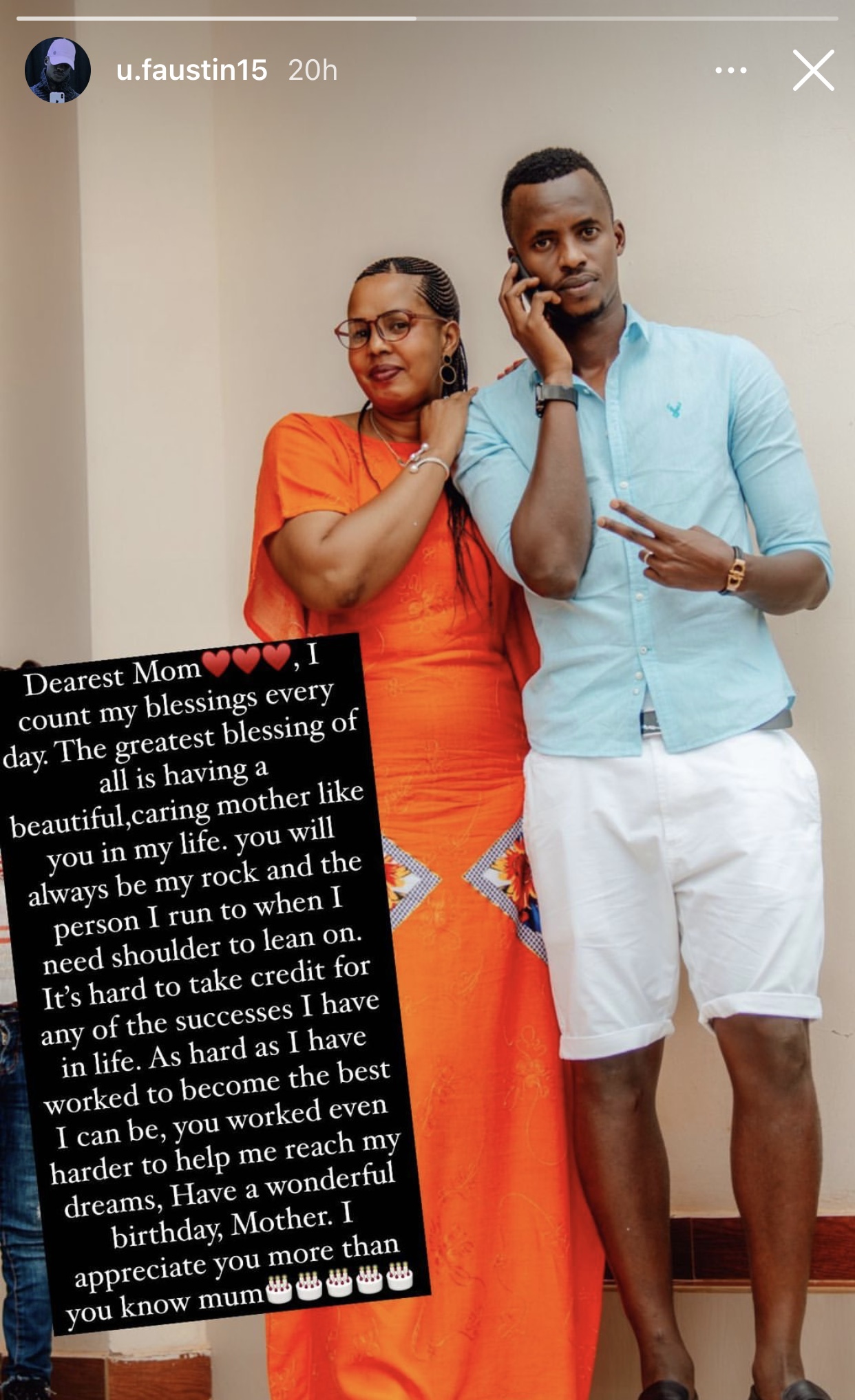 Ku munsi w’ejo nibwo hari isabukuru y’amavuko ya Mama wa Usengimana Faustin. Faustin abinyujije kuri story ya instagram ye yifurije umubyeyi we isabukuru nziza amushimira uburyo akomeje kumubera umubyeyi mwiza, ko amukunda ndetse anamushimira uko amwitaho mu buzima bwa buri munsi.