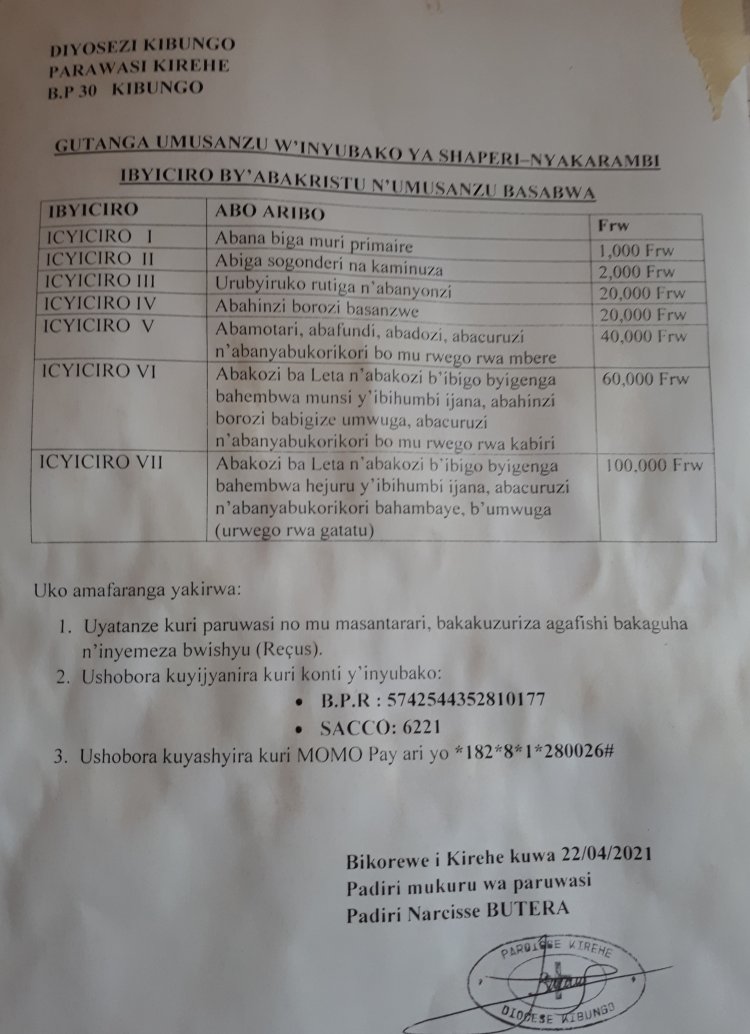 Muri 2021 mu kwezi kwa Mata, nibwo Paruwasi ya Kirehe yasohoye itangazo rigaragaza buri kiciro umukristo abarizwamo ndetse n’umusanzu azatanga kugirango Shapere iriho yubakwa muri Santre ya Nyakarambi azashobore kuba yuzuye.