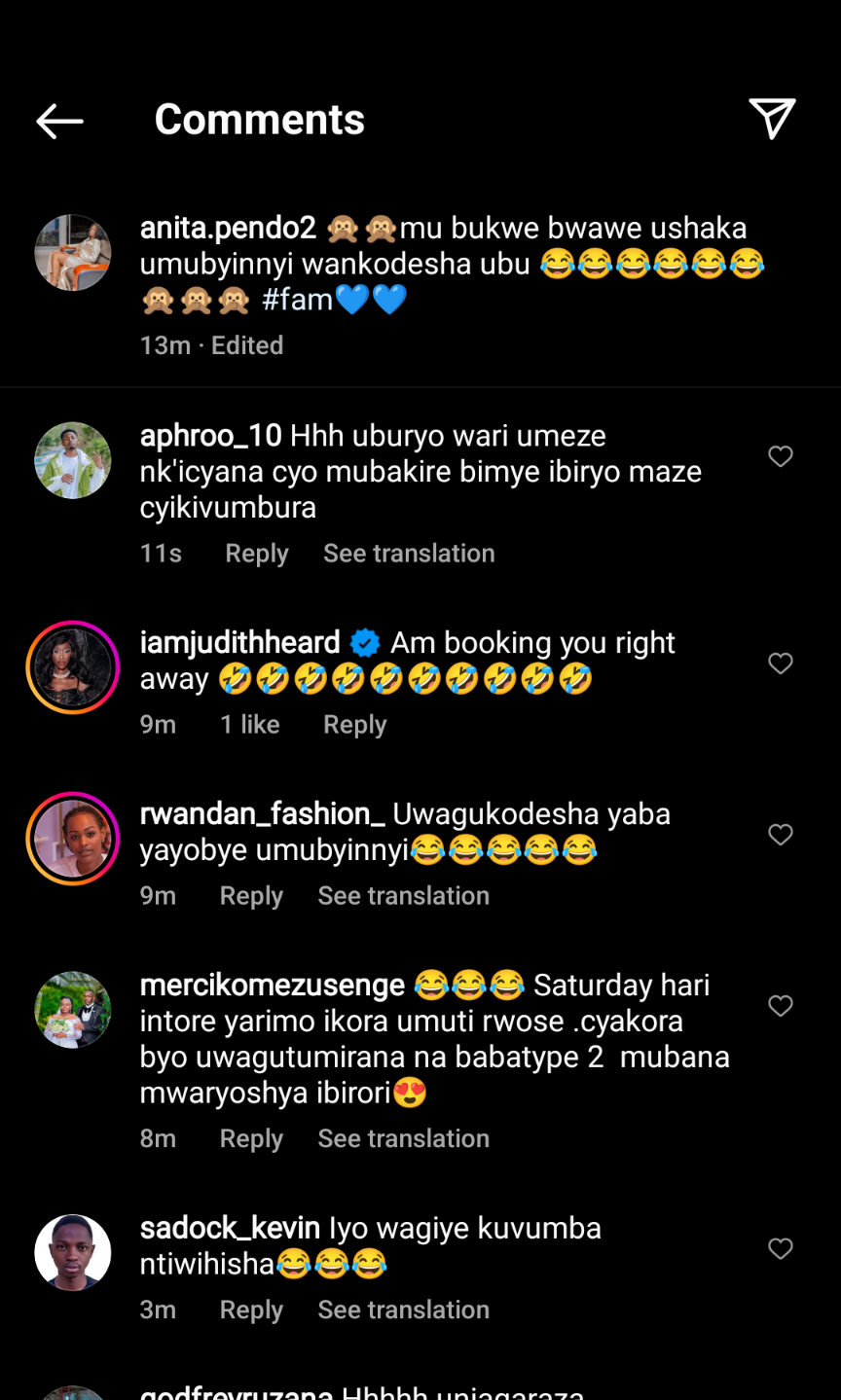 Anita Pendo uzwiho gususurutsa imbaga y’abantu yashyize ku rubuga rwe rwa Instagram ifoto ari mu bukwe yizihiwe ari gucinya akadiho maze munsi agira ati:”Mubukwe bwawe ushaka umubyinnyi wankodesha ubu” akimara gutangaza aya magambo abantu batangiye kugenda bavuga uko babyumva.