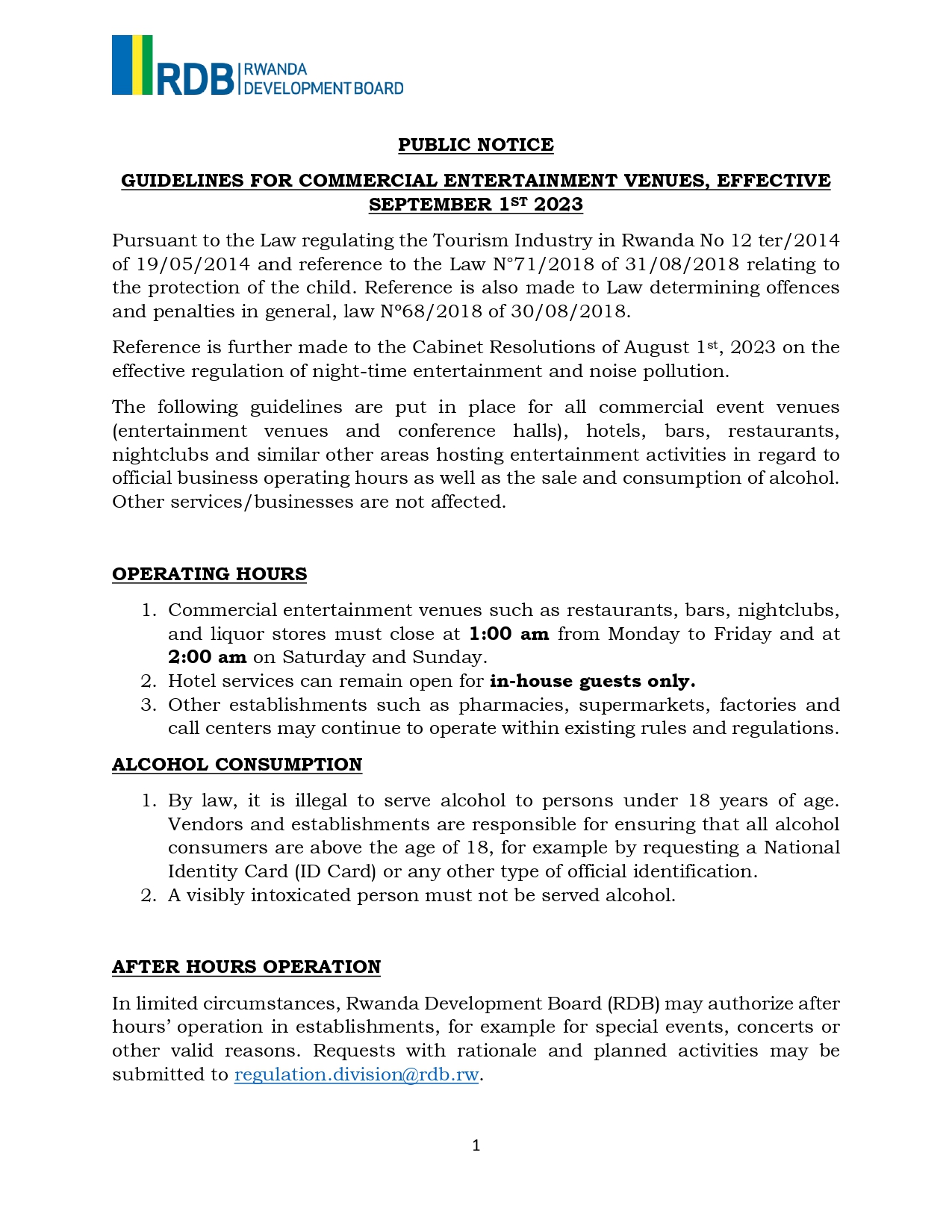 Mu itangazo ryashyizweho umukono n’Umuyobozi Mukuru w’Uru rwego, Akamanzi Clare, kuri uyu wa Gatatu tariki 30 Kanama 2023, rigaragaza ko resitora, utubari, utubyiniro n’ububiko bwa Liquor bizajya bifunga saa Saba z’igicuku guhera ku wa Mbere kugeza ku wa Gatanu.