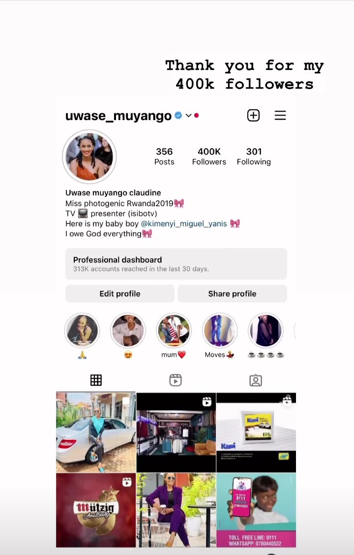 Uyu mumama akaba umugore w’umukinnyi w’umupira w’amaguru Kimenyi Yves, yujuje abantu bamukurikira ibihumbi 400 ku rubuga rwa Instagram (400k follower).