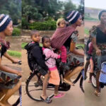 Abadamu bararakaye pe! Umudamu yagaragaye mu muhanda atwaye igare atwayeho abana ndetse ahetse n’undi mu mugongo