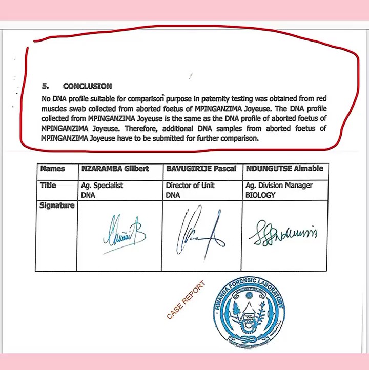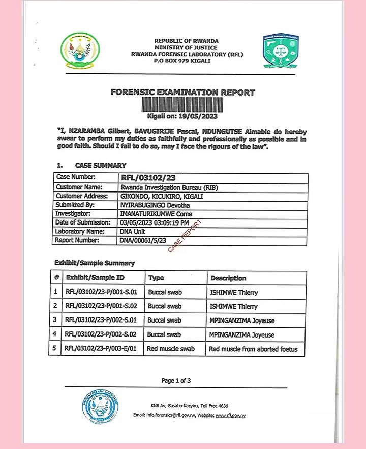 Raporo yo muri raboratwari y’igihugu ipima ibimenyetso bya gihanga “Rwanda Forensic Laboratory” yo kuwa 19 Gicurasi 2023, nkuko ibigaragaza mu mwanzuro wayo, yemeje ibi bikurikira.