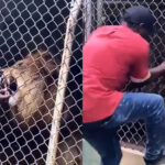 Ubwiyemezi nibwo bumukozeho! Umusore yashatse kwemeza abakobwa akora mu kwanwa k’intare iziritse yashonje