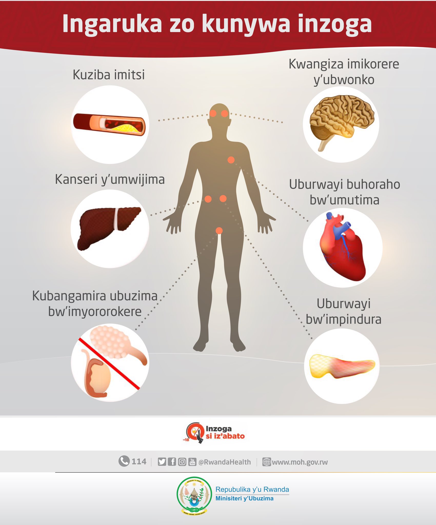 Minisiteri y’Ubuzima mu Rwanda inyuze ku mbuga nkoranyambaga zayo zirimo Twitter yatangarije abanyarwanda ingaruka mbi ku muntu ukunda kunywa inzoga nyishi.