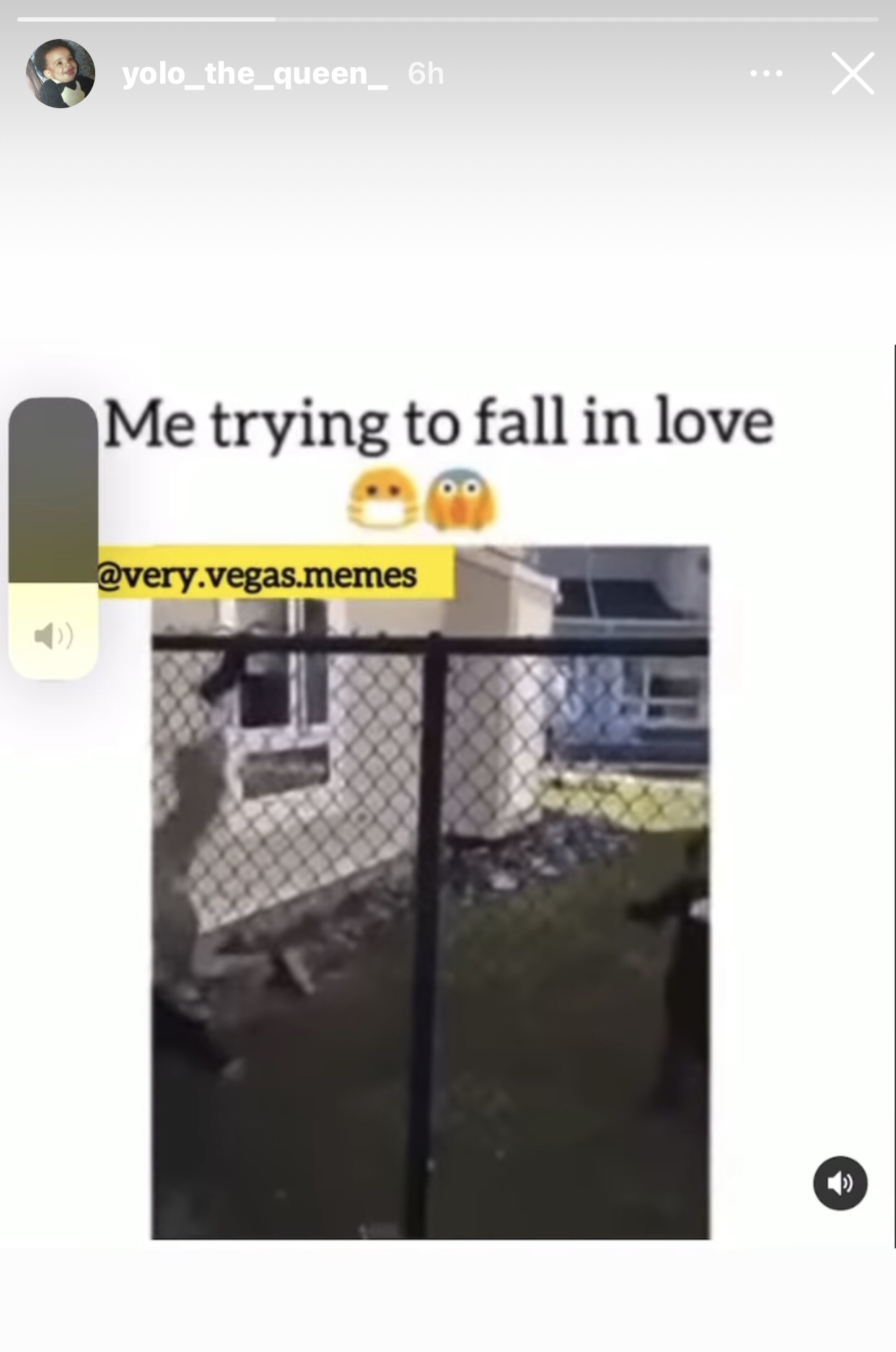 Abinyujije kuri story ya instagram ye, Yolo The Queen yashyizeho aka meme kakozwe na very vegas memes aho hariho umusore ushaka gusimbuka uruzitiro rw’inzu akaguru ke kagafatirwa muri senyenge nawe yerekana ko bitajya bimuhita ko nawe urukundo arugwamo neza.