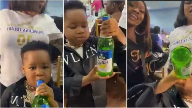 Umuhungu yitonze afata ikinyobwa kandi yitwara nkumuntu mukuru muburyo yabyinaga icupa rinini.Abakoresha instagram banenze uyu mubyeyi ureresha umwana we inzoga bavuga ko bidakwiye.