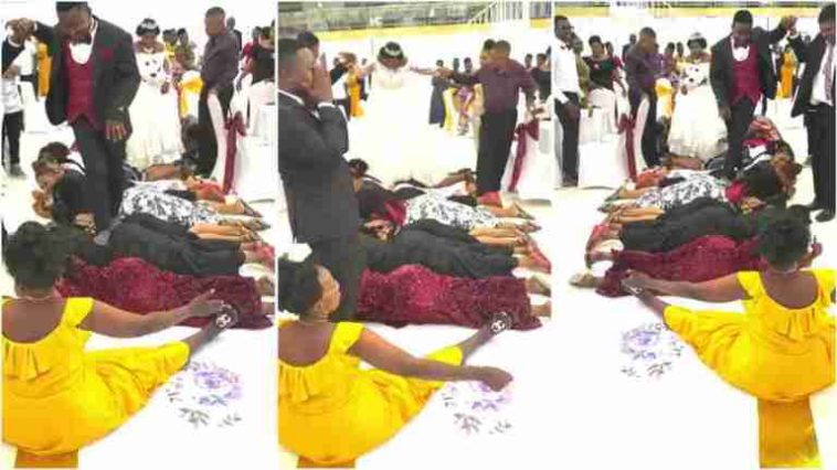 Muri iyo videwo, itsinda ry’abagore bagaragara baryamye hasi bubitse inda maze abageni babanyuraho babakandagira ku migongo nk’abaragenda kuri tapi y’umutuku.