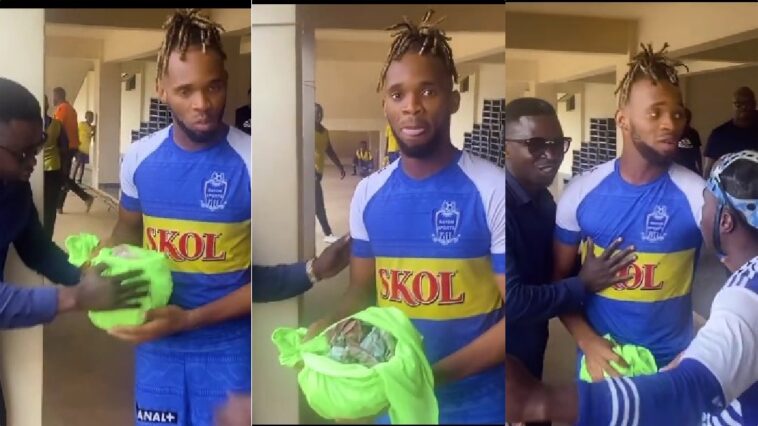 Rutahizamu Andere Willy Essombe Onana yagaraje akanyamuneza ku maso nyuma yo guhabwa amafaranga n’abafana ba Rayon Sports.