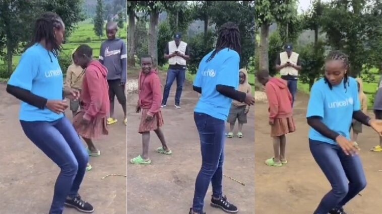 Ni amashusho Mukansanga Salima yasangije abamukurikira ku rukuta rwe rwa Instagram arimo asimbuka ndetse n’undi mwana muto w’umukobwa.