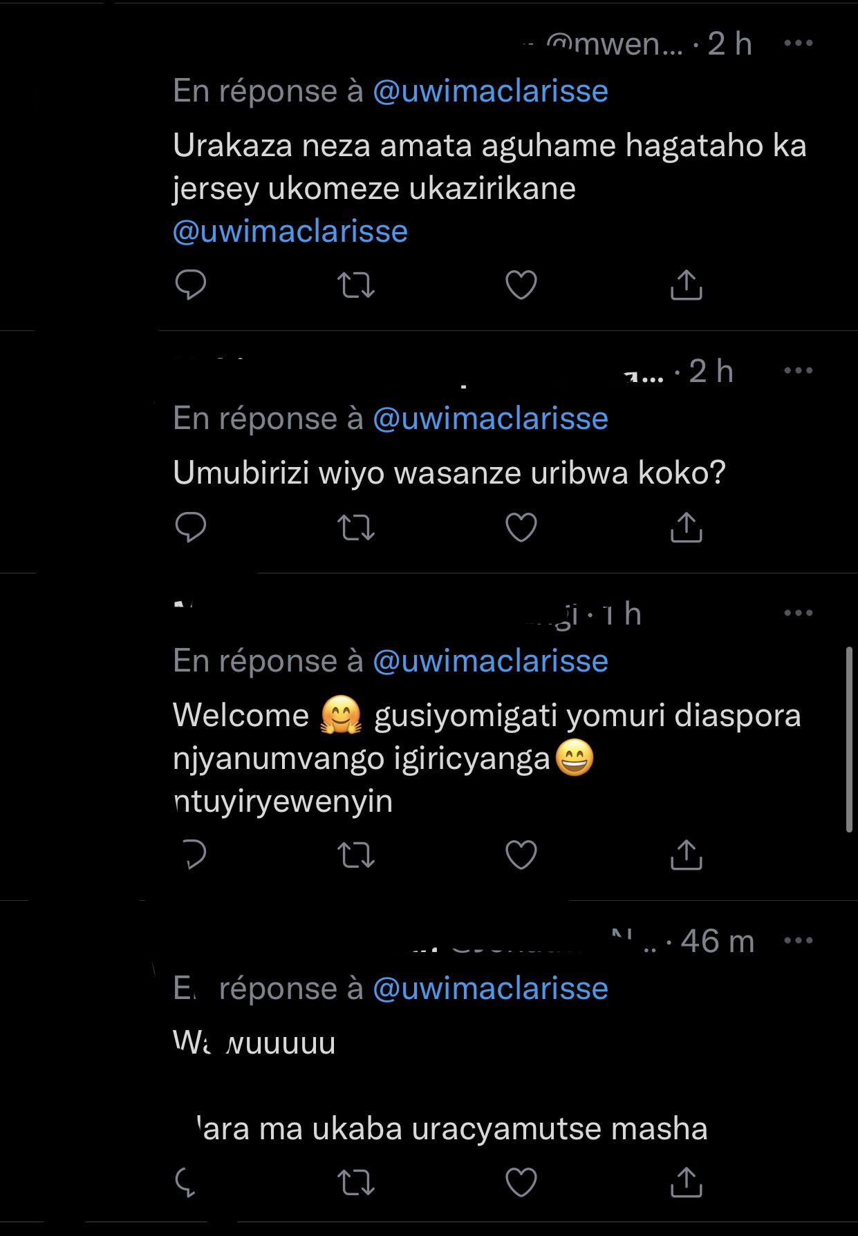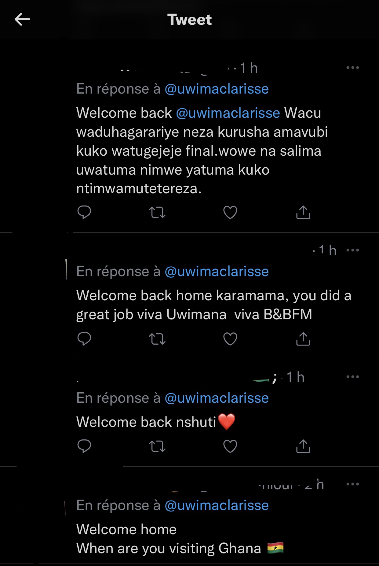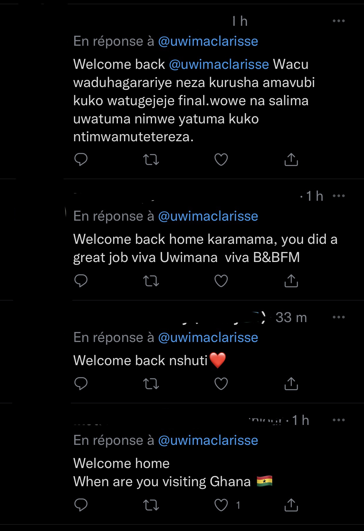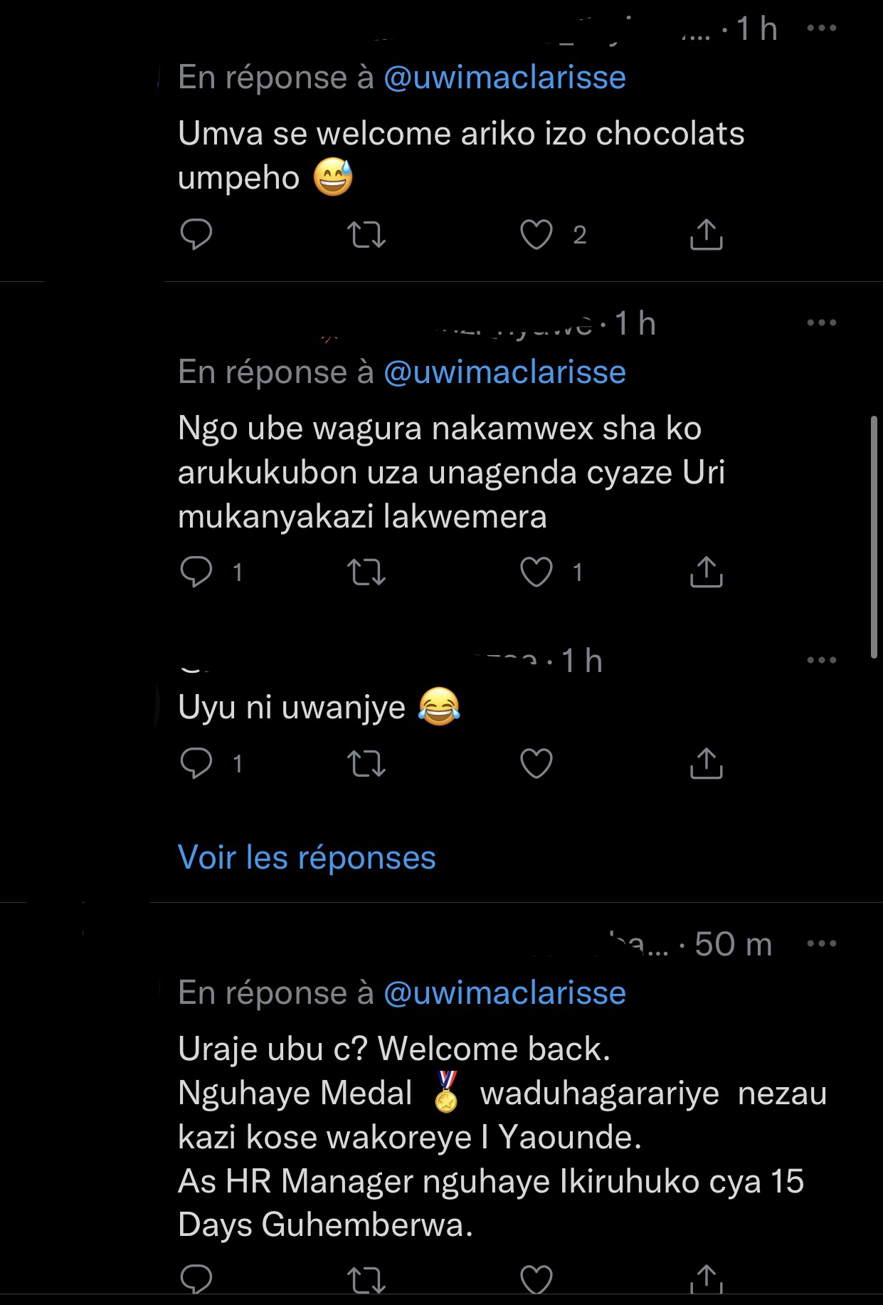 Nyuma yuko Clarisse Uwimana yanditse aya magambo kuri Twitter, umwe mu bamukurikirana yamubwiye amagambo agira ati Welcome back @uwimaclarisse Wacu waduhagarariye neza kurusha amavubi kuko watugejeje final.wowe na salima uwatuma nimwe yatuma kuko ntimwamutetereza”. Ibindi byatangajwe n’abakurikira Clarisse Uwimana kuri Twitter ni ibi bikurikira: