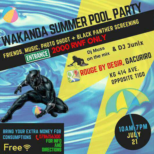 Wakanda Summer Pool party ni igitaramo cyateguwe na Rwagaju Paul. Iki gitaramo ni kimwe mu bitaramo byitezweho kuzitabirwa nabantu benshi dore ko kibaye mu gihe abanyeshuri benshi bari mu biruhuko (summer vacations). Iki gitaramo kizabera i Gacuriro ahitwa ROUGE BY DESIR ku wa gatandatu tariki ya 21 Nyakanga 2018 guhera saa yine za mu gitondo (7AM) kugeza saa moya za nimugoroba (7PM).