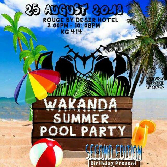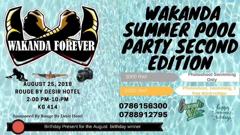 Wakanda summer pool party, igitaramo kimaze kumenyerwa na benshi kubera udushya n’ubunararibonye giteguranwa kigiye kongera kuba ku nshuro yacyo ya kabiri aho noneho cyateguranywe umwihariko w’udushya twinshi nkuko bamwe mu bategura iki gitaramo babitangarije YEGOB. Kuri iyi nshuro ya kabiri y’iki gitaramo nkuko bamwe bakunze kubivuga bagira bati “Wakanda summer pool party second edition” hateguwe byinshi ndetse hari n’udushya twinshi duteganyirijwe buri wese uzitabira iki gitaramo by’umwihariko impano zidasanzwe zizahabwa umwe mu bavutse mu kwezi kwa kanama uzatsinda ibibazo azabazwa ndetse n’ibindi bishimishije. Iki gitaramo kizabera muri Rouge by desir hotel iherereye i Gacuriro ku wa gatandatu tariki ya 25 Kanama 2018 guhera saa munani zuzuye z’amanywa (2:00PM) kugeza saa yine n’iminota umunani z’ijoro (10:08PM). Kwinjira muri iki gitaramo ni amafaranga ibihumbi bitatu (Silver ticket) ndetse n’ibihumbi bitanu (gold ticket). Abazinjirira ku maticye ya 3000Frw bazaba bemerewe kwifotoza ku buntu ndetse no koga naho abazinjirira ku maticye ya 5000Frw bazaba bemerewe kwifotoza ku buntu, koga ndetse n’ikinyobwa kimwe bifuza kongeraho ifiriti.