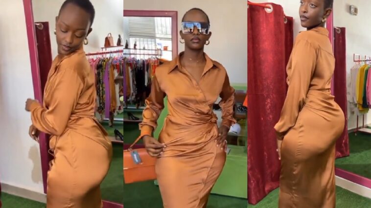 Aba ari kubikorera mu iduka rye ry’imyenda aho aba yambaye ikanzu yereka ikimero cye.