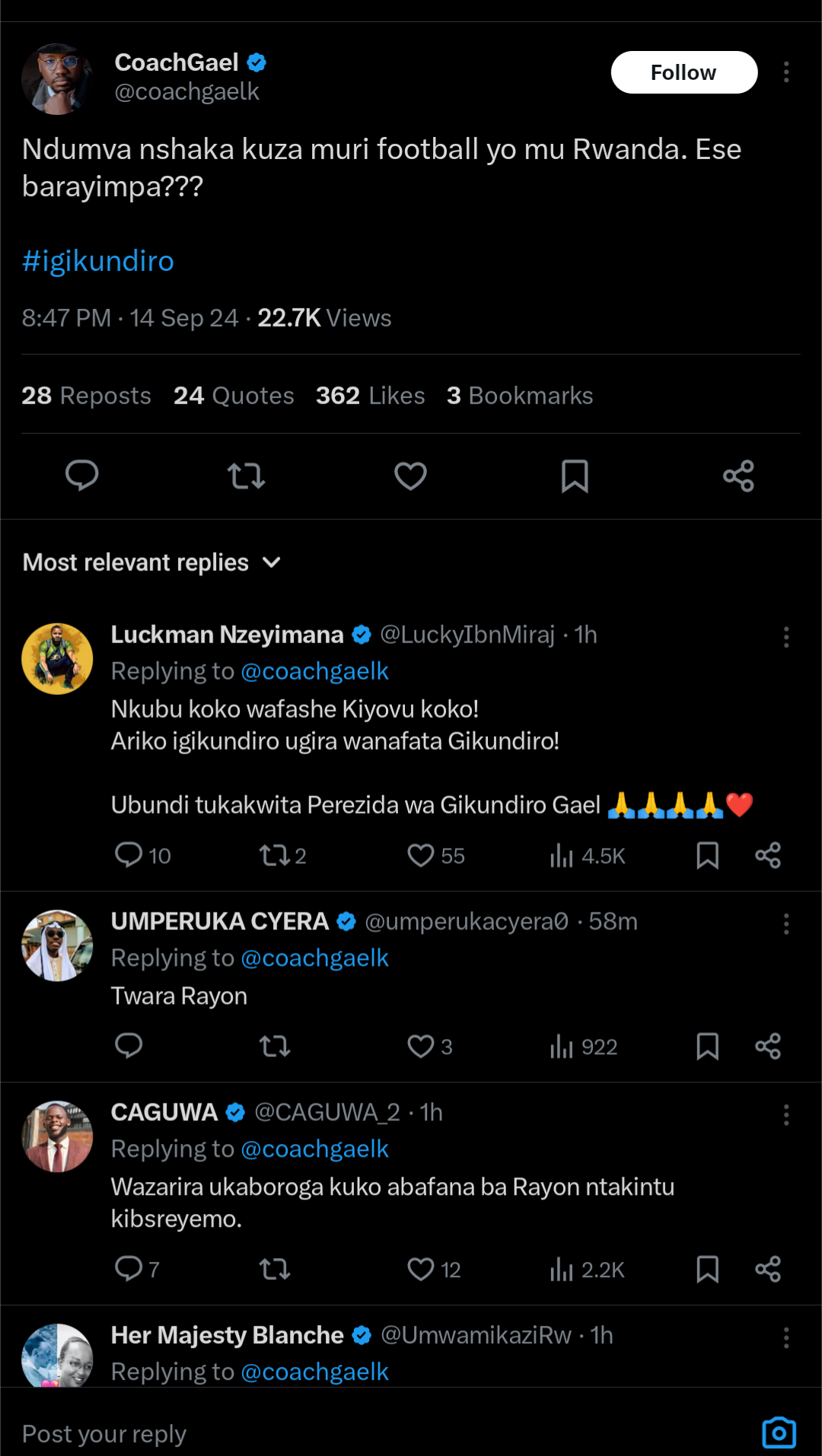 Amakuru atangiye gukwirakwira ku mbuga nkoranyambaga n’uko Umushoramari Karomba Gael (Coach Gael) yaciye amarenga ko yifuza kuyobora iyi kipe ya Rayon Sports  nyuma yo gushora amafaranga muri Basketball yo mu Rwanda.