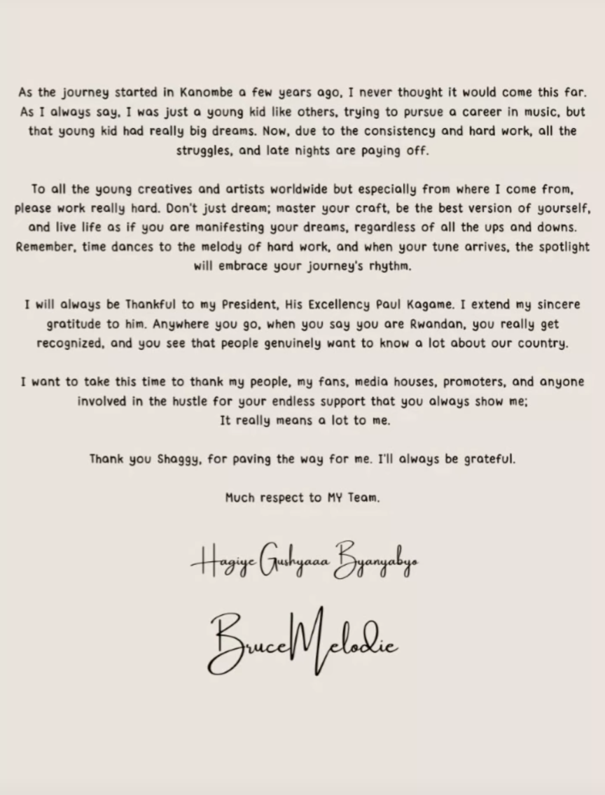 Icyamamare muri muzika y’Afurika Itahiwacu Bruce wamamaye cyane ku izina rya Bruce Melodie ukomeje kugirira ibihe byiza muri Leta Zunze Ubumwe z’Amerika aho aherutse gukorera igitaramo ari kumwe n’icyamamare muri muzika y’Isi Shaggy yagiye ku mbuga nkoranyambaga ze ashimira Perezida Paul Kagame kubera ahantu agejeje u Rwanda ndetse no kuba agera ahantu yavuga ko ari umunyaRwanda agahabwa agaciro.
