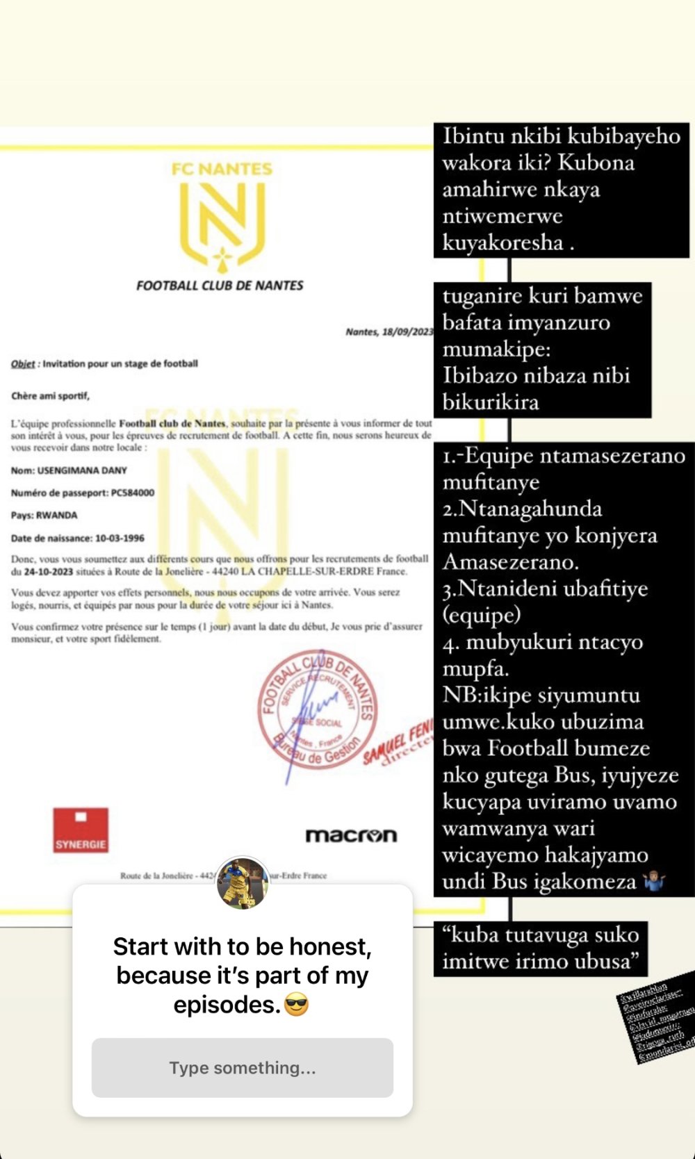 Yashyizeho ifoto igaragaza ubutumire FC Nantes yamuhaye ayikurikiza amagambo agira ati “Ibintu nk’ibi bikubayeho wakora iki? Kubona amahirwe nk’aya ntiwemererwe kuyakoresha. Tuganire kuri bamwe bafata imyanzuro mu makipe.”