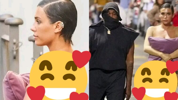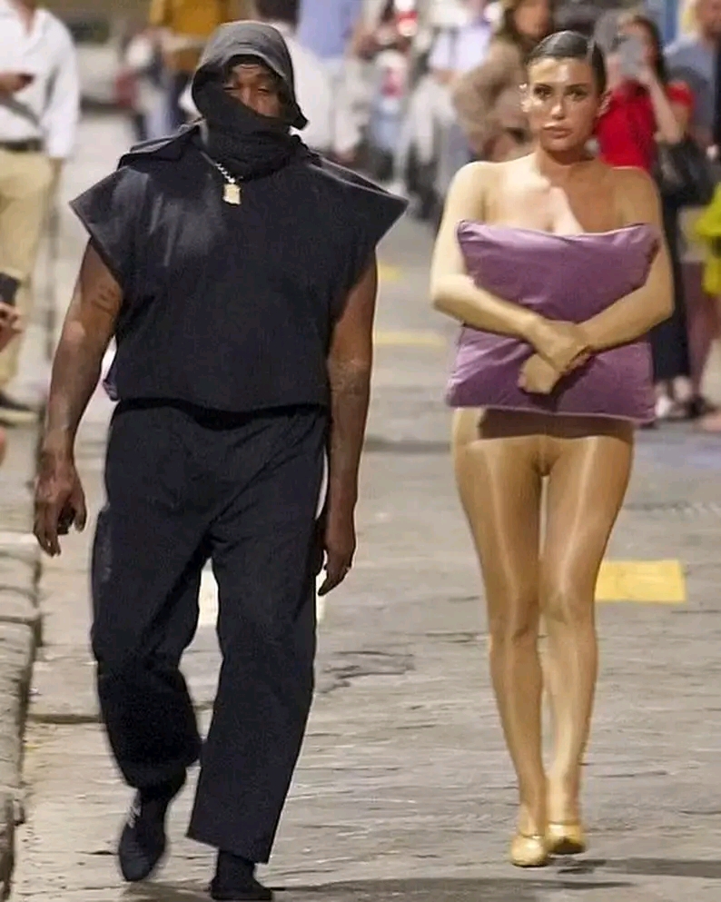 Yakinzeho umusego! Umugore mushya wa Kanye West yagiye mu muhanda yambaye ubusa abantu batangiye kumurarikira ahita ahishaho umusego (AMAFOTO)