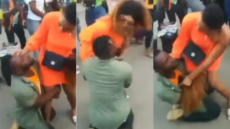 Hari amashusho ari kuzenguruka ku mbuga nkoranyambaga, agaragaza umukobwa arimo atubita umusore wari wagerageje kumuterera ivi mu muhanda, maze arabyanga.