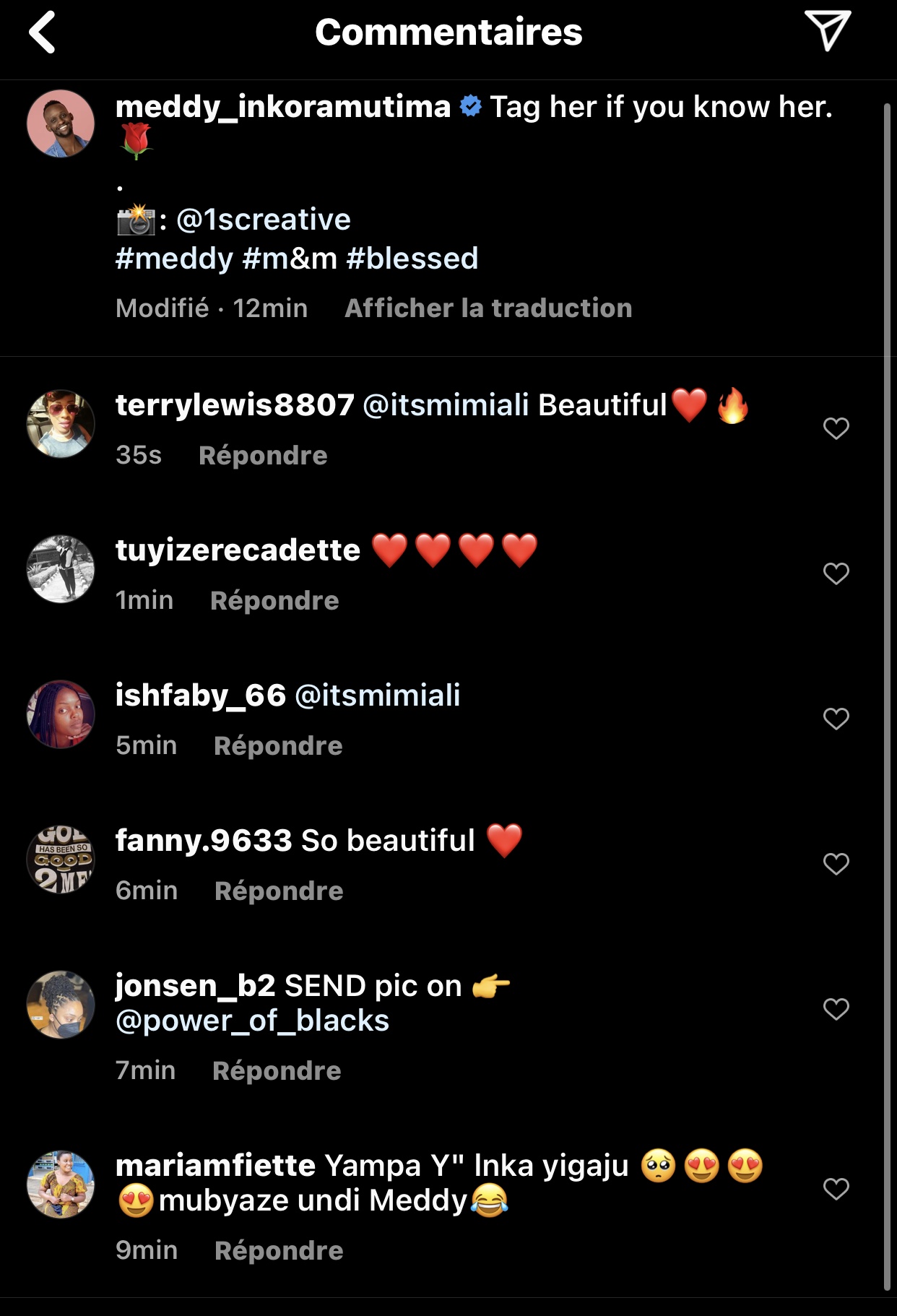 Ku rubuga rwa instagram hasakajwe ifoto ya Mimi Ali, umugore wa Meddy nuko umwe mu bafana ba Meddy wayibonye asaba Meddy ko yamubaza undi mwana. Iyo foto ni iyi ikurikira: