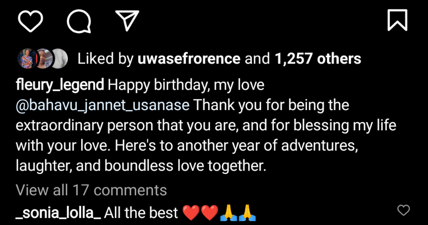 Abinyujije ku mbuga nkoranyambaga ze Fleury Legend yifurije umugore we Bahavu Jannet isabukuru nziza y’amavuko maze amushimira byimazeyo kuba yaramukunze ndetse n’uburyo yamuhinduriye ubuzima kubera urukundo yamuhaye.