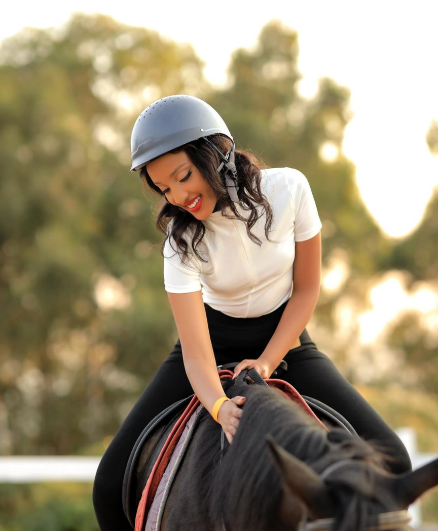 Miss Muheto Divine uzwiho kugira uburanga burangaza benshi yifashishije imbuga nkoranyambaga ze yasangije abakunzi be amafoto meza cyane yicaye hejuru y’Ifarashi: