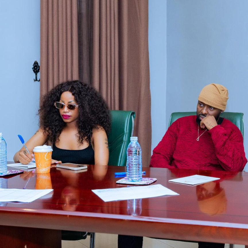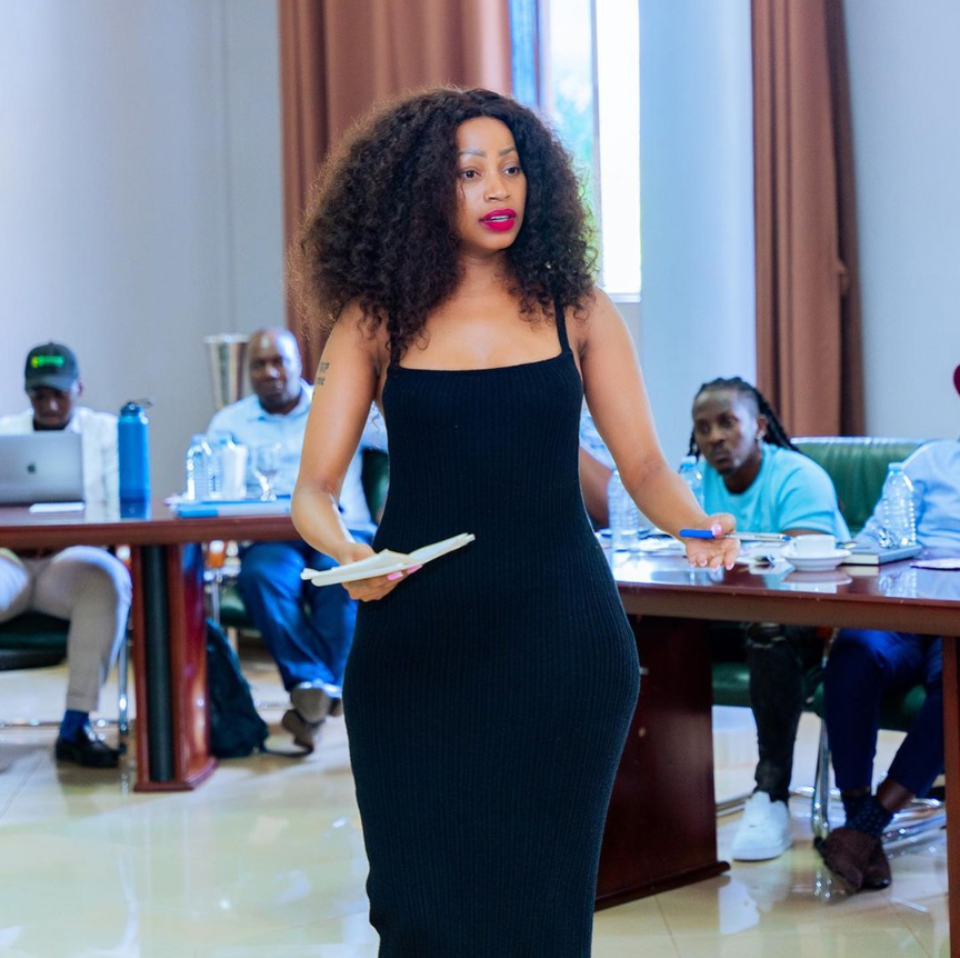 Dore amafoto meza cyane y’umuhanzikazi Sheebah Karungi yashyize ku mbuga nkoranyambaga ze ari kumwe na bagenzi be bafatanyijje kuyobora ishyirahamwe rishya ry’abahanzi muri Uganda rya UNMF: