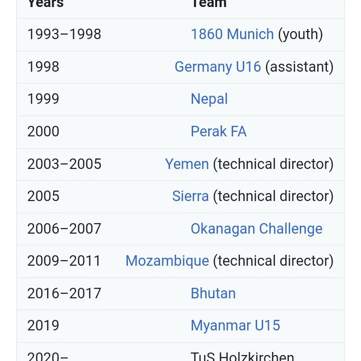 Uyu mugabo w’imyaka 61 y’amavuko, yatoje amakipe atandukanye kandi akomeye harimo nka Bayern Munich y’abato, Ubudage U-16, Nepal, Yemen na Mozambique ndetse n’izindi.