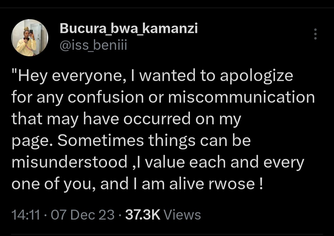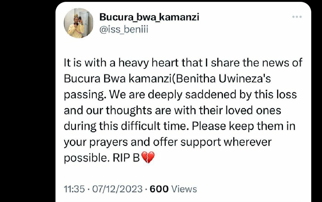 Ku rubuga rwa Twitter, Umukobwa uzwi nka Bucura bwa Kamanzi ukoresha Handle ya @iss_beniii yakuye abantu imitima ubwo yavugaga ko yapfuye.
