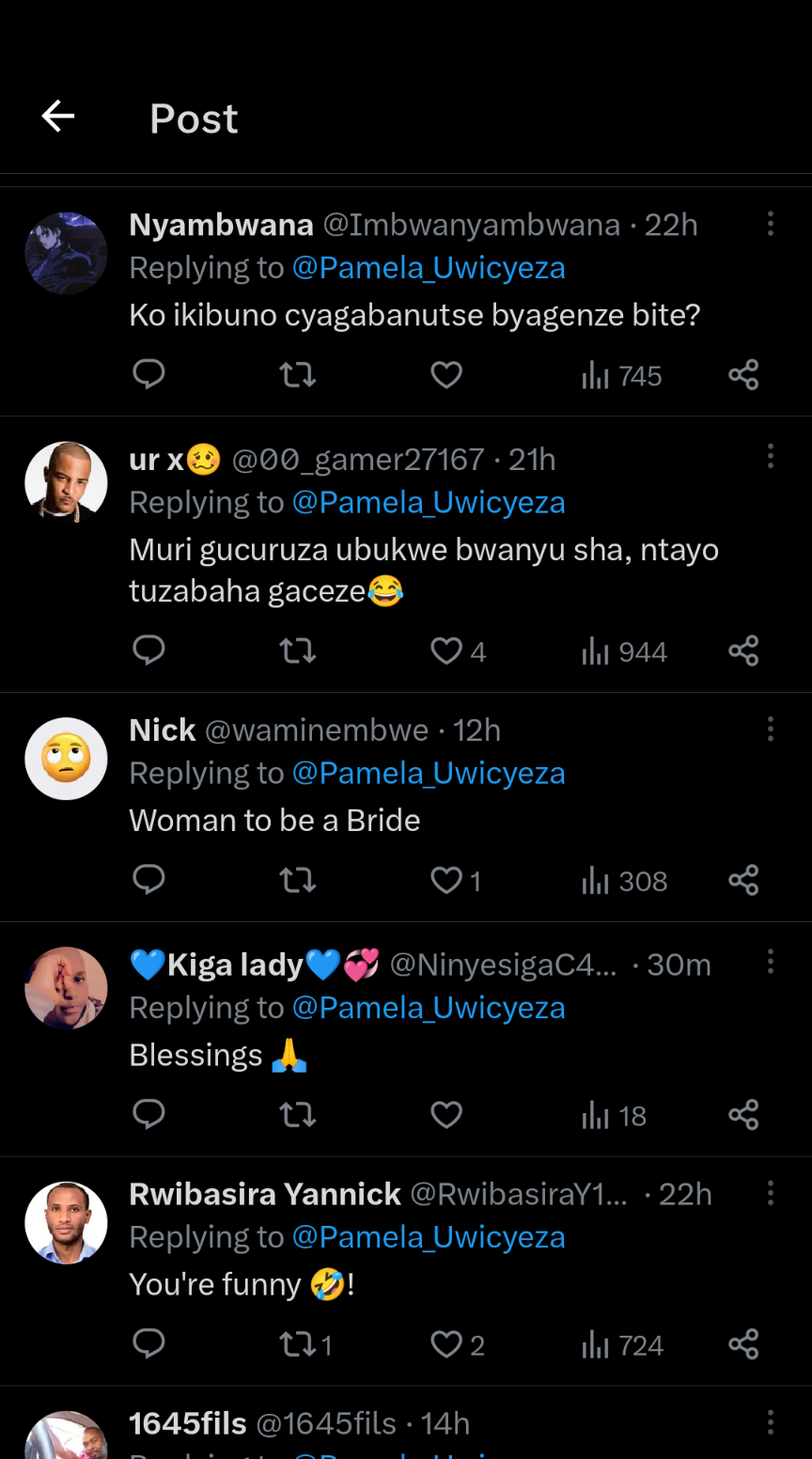 Miss Uwicyeza Pamella witegura kurushinga na The Ben yibasiwe nabakoresha urubuga rwa X nyuma yo kuvuga ko ari umugeni witegura kuba umugore gusa bamwe mu bantu banga ibyiza ntacyo bitwaye batangiye kumwataka bamwibutsa ko atari we mugore wa mbere ugiye gukora ubukwe abandi nabo bati n’ubundi usanzwe uri umugore.