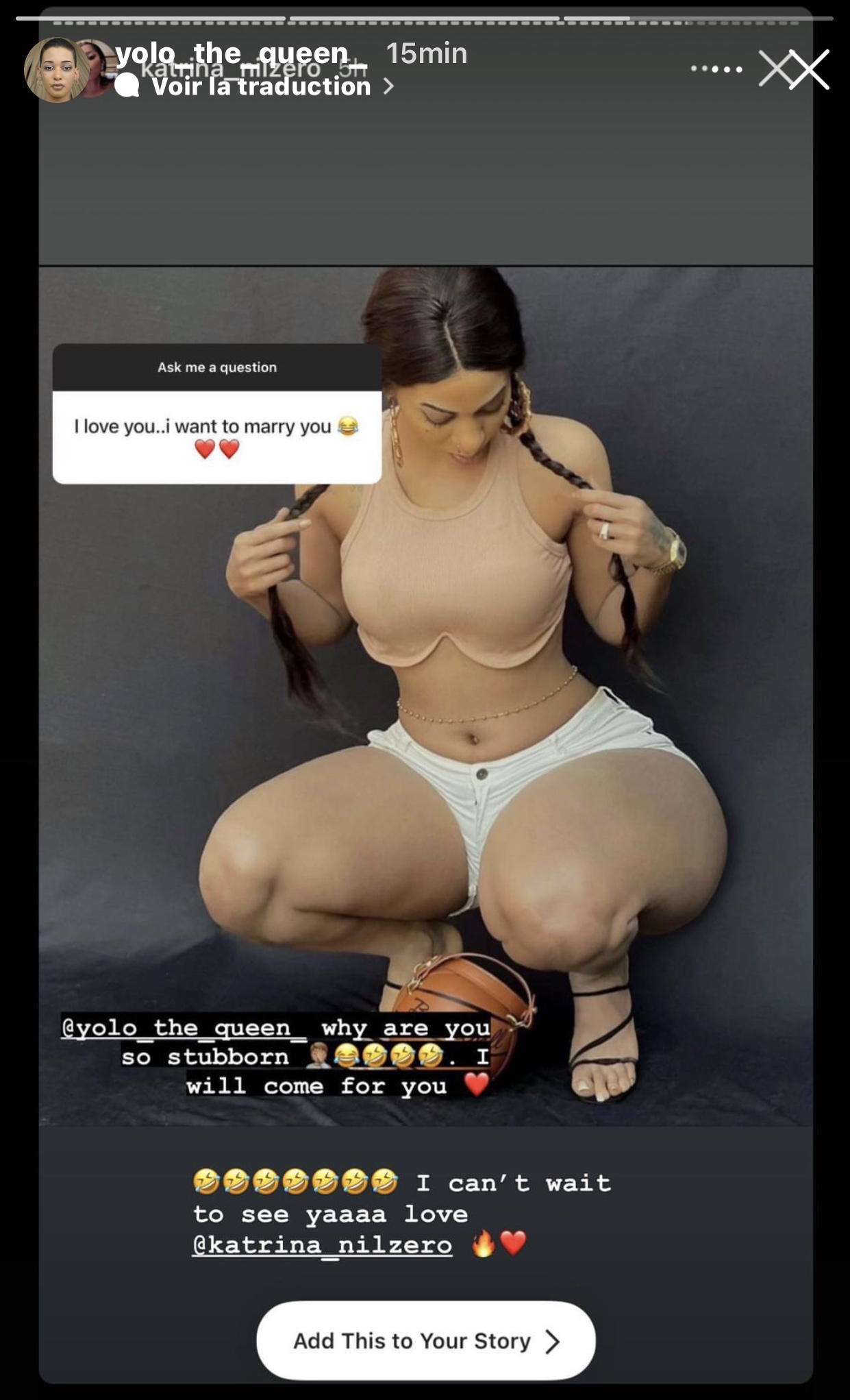 Nkuko bigaragazwa na story ya instagram Yolo The Queen yerekanye, uyu mufana wa Yolo The Queen yanditse amagambo agira ati « I love you… i want to marry you 😂❤️❤️ ».